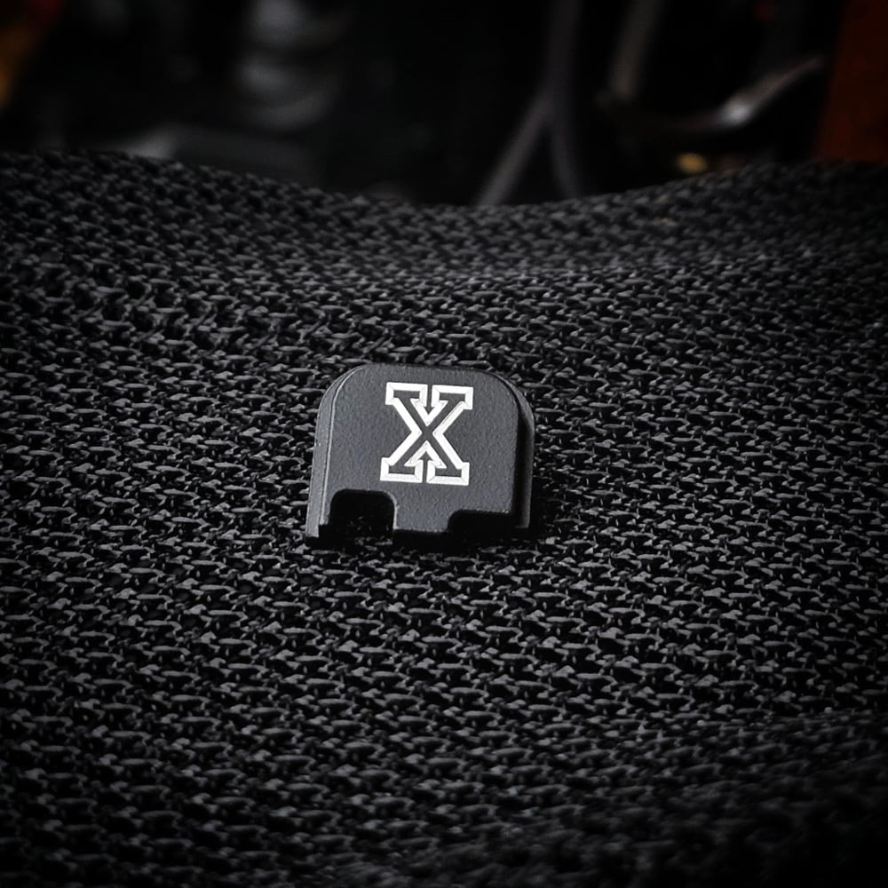Our signature X laser engraved on a black anodized aluminium back plate. Sized to fit double stack Glock, single stack Glock, and Sig Sauer M17/M18 pistols only.