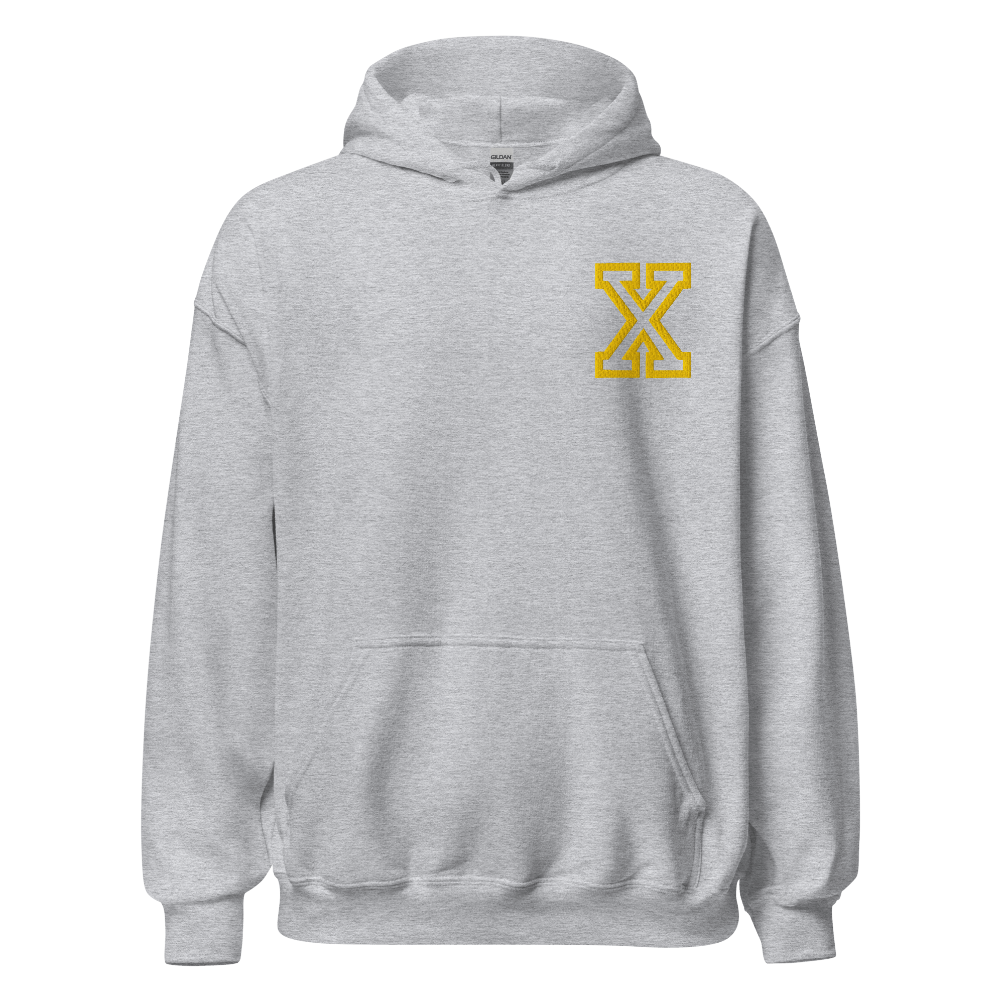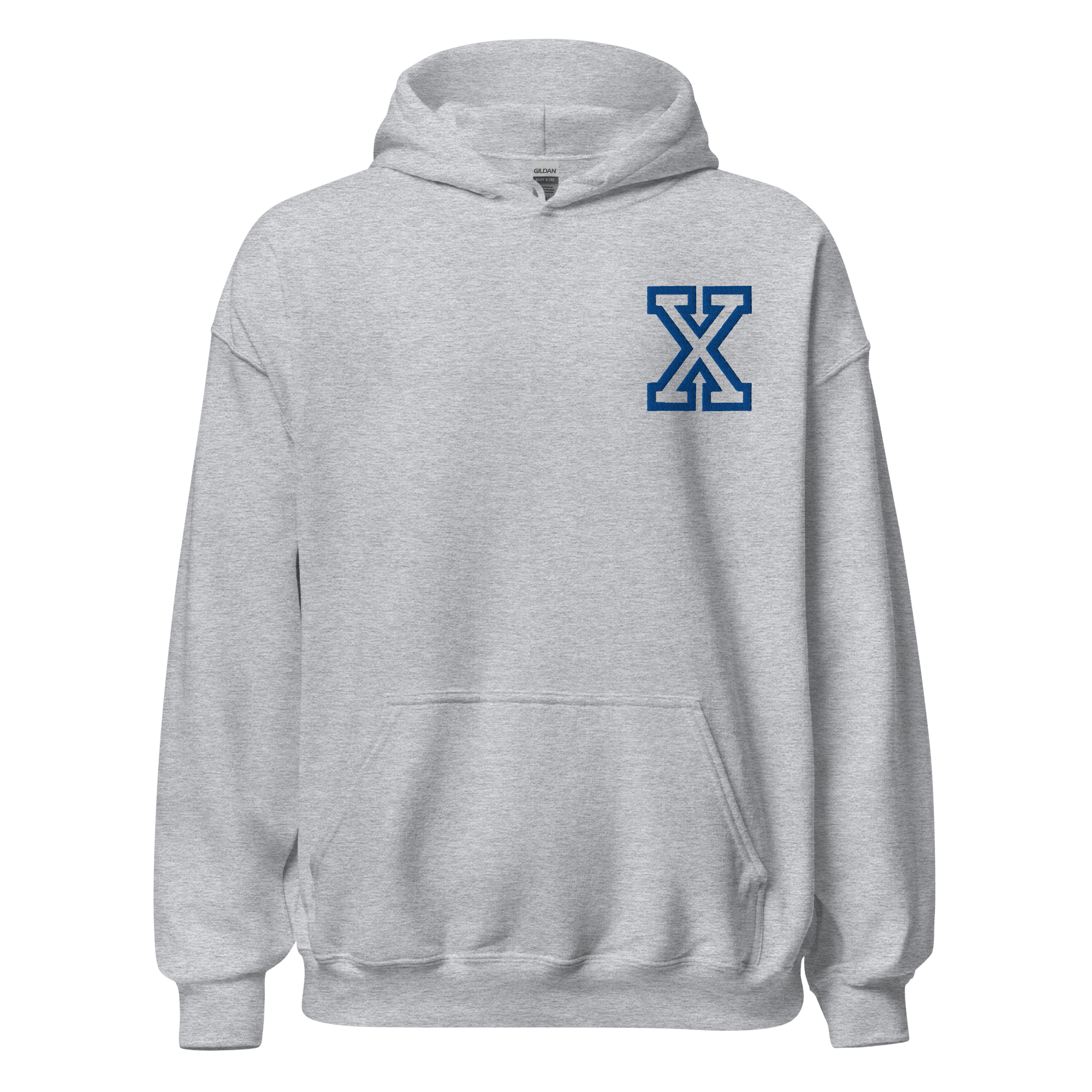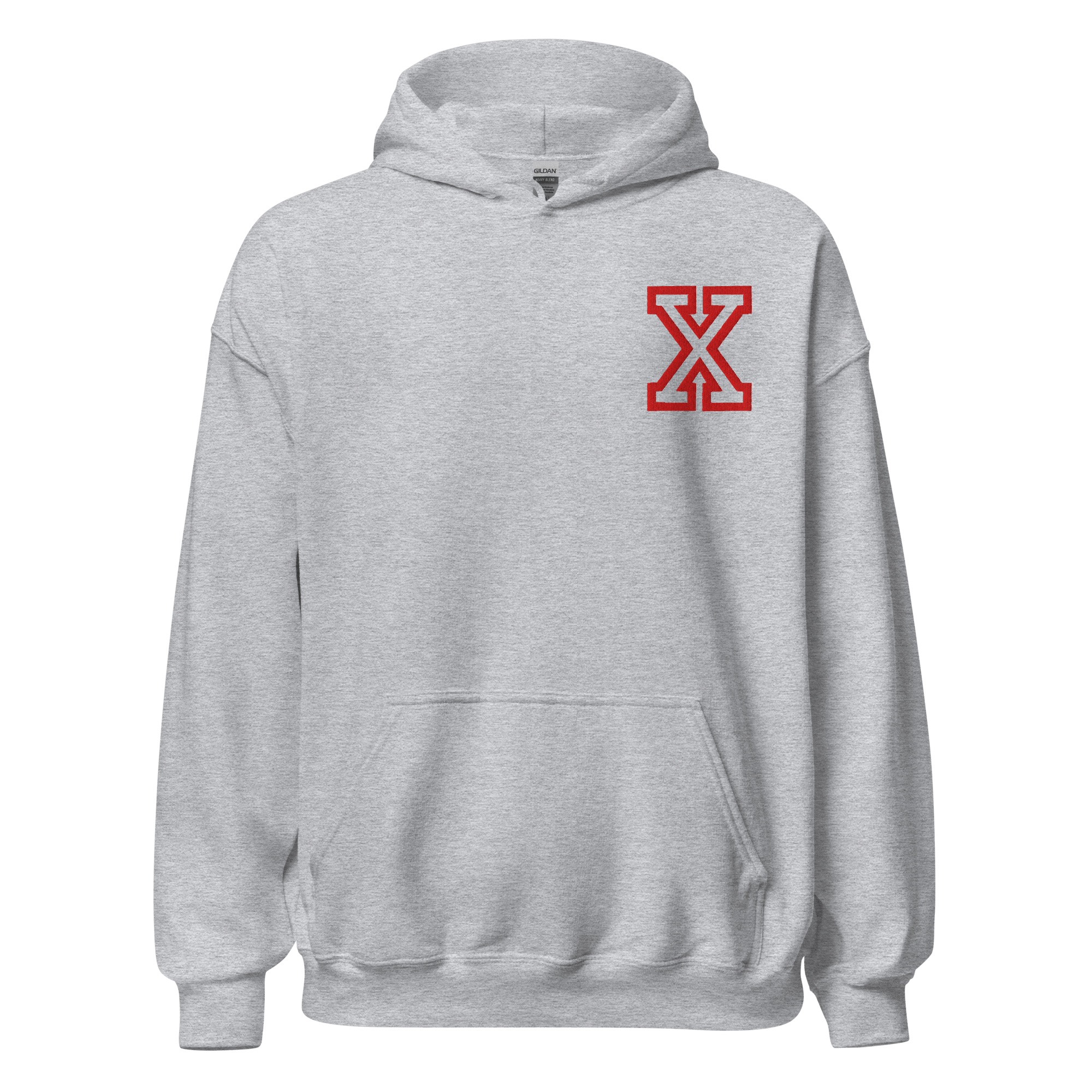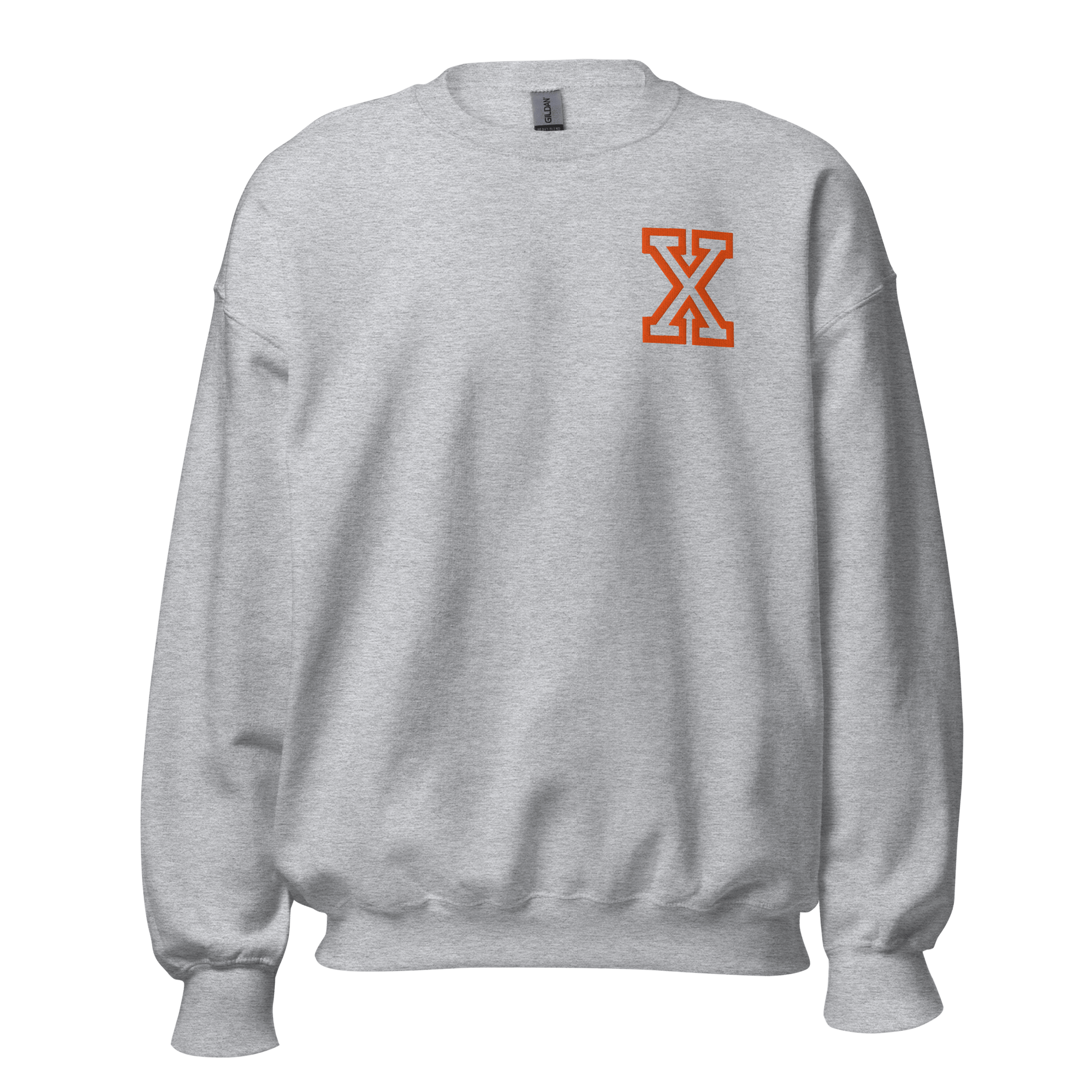 Our signature X embroidered on the left chest (NO BACK DESIGN) on your choice of Gildan 18500 heavy blend 50/50 poly/cotton pullover hooded sweatshirt or Gildan 18000 heavy blend 50/50 poly/cotton crewneck sweatshirt in ATHLETIC GREY, with your choice of embroidery color. Lots of options here, so go crazy!