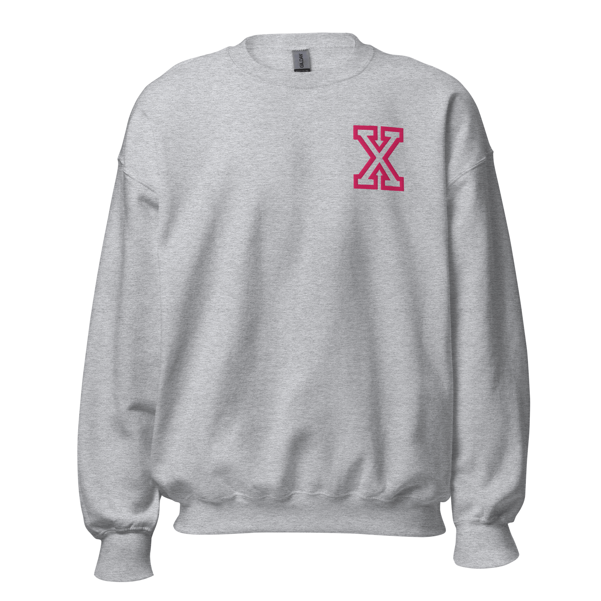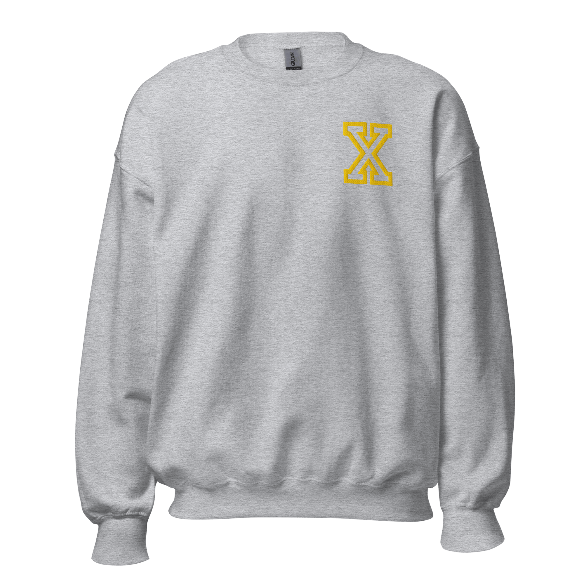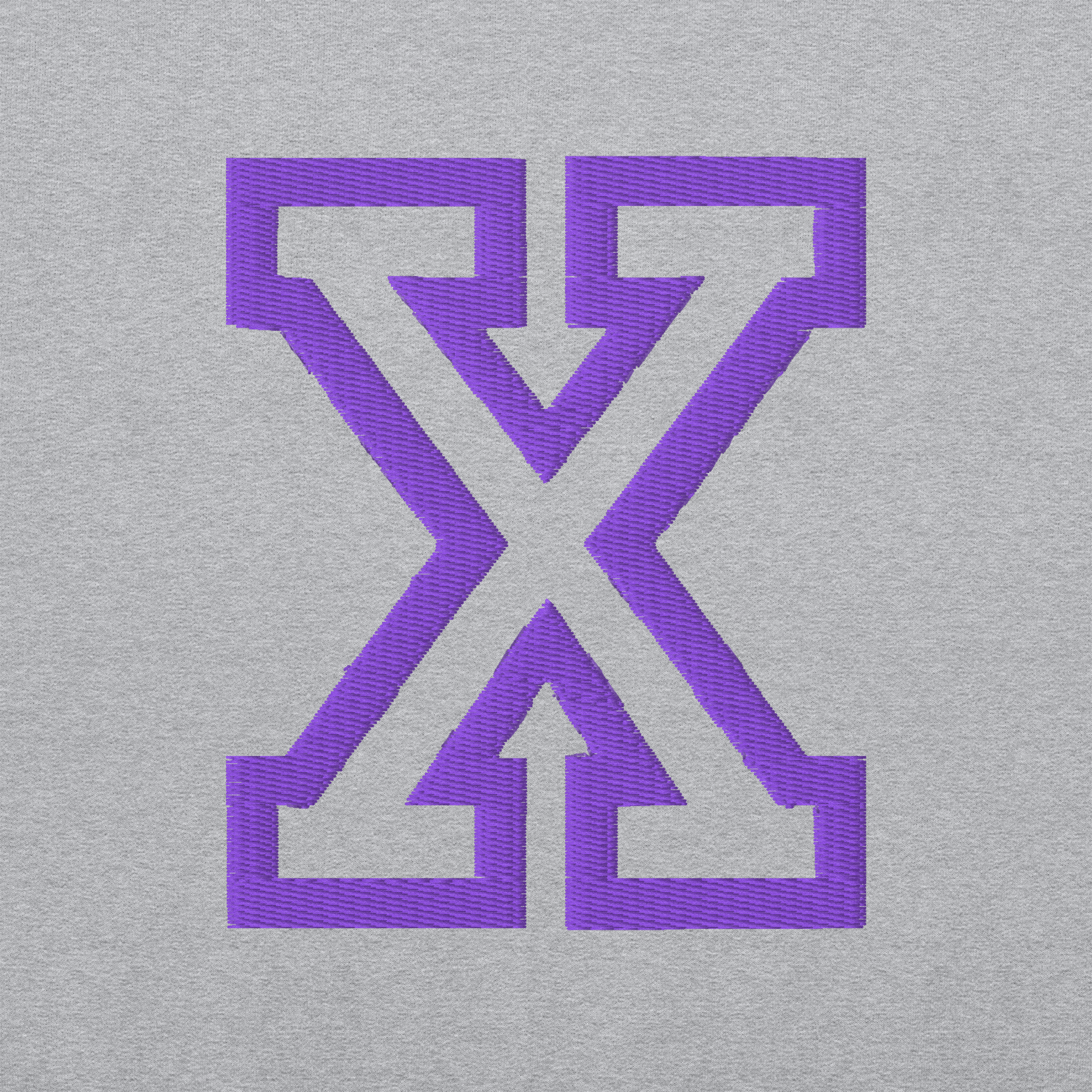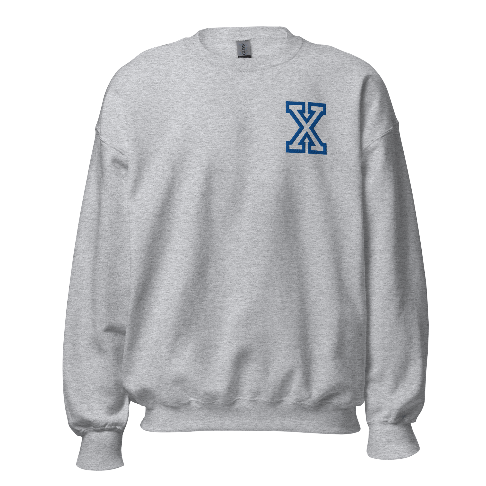 Our signature X embroidered on the left chest (NO BACK DESIGN) on your choice of Gildan 18500 heavy blend 50/50 poly/cotton pullover hooded sweatshirt or Gildan 18000 heavy blend 50/50 poly/cotton crewneck sweatshirt in ATHLETIC GREY, with your choice of embroidery color. Lots of options here, so go crazy!