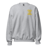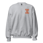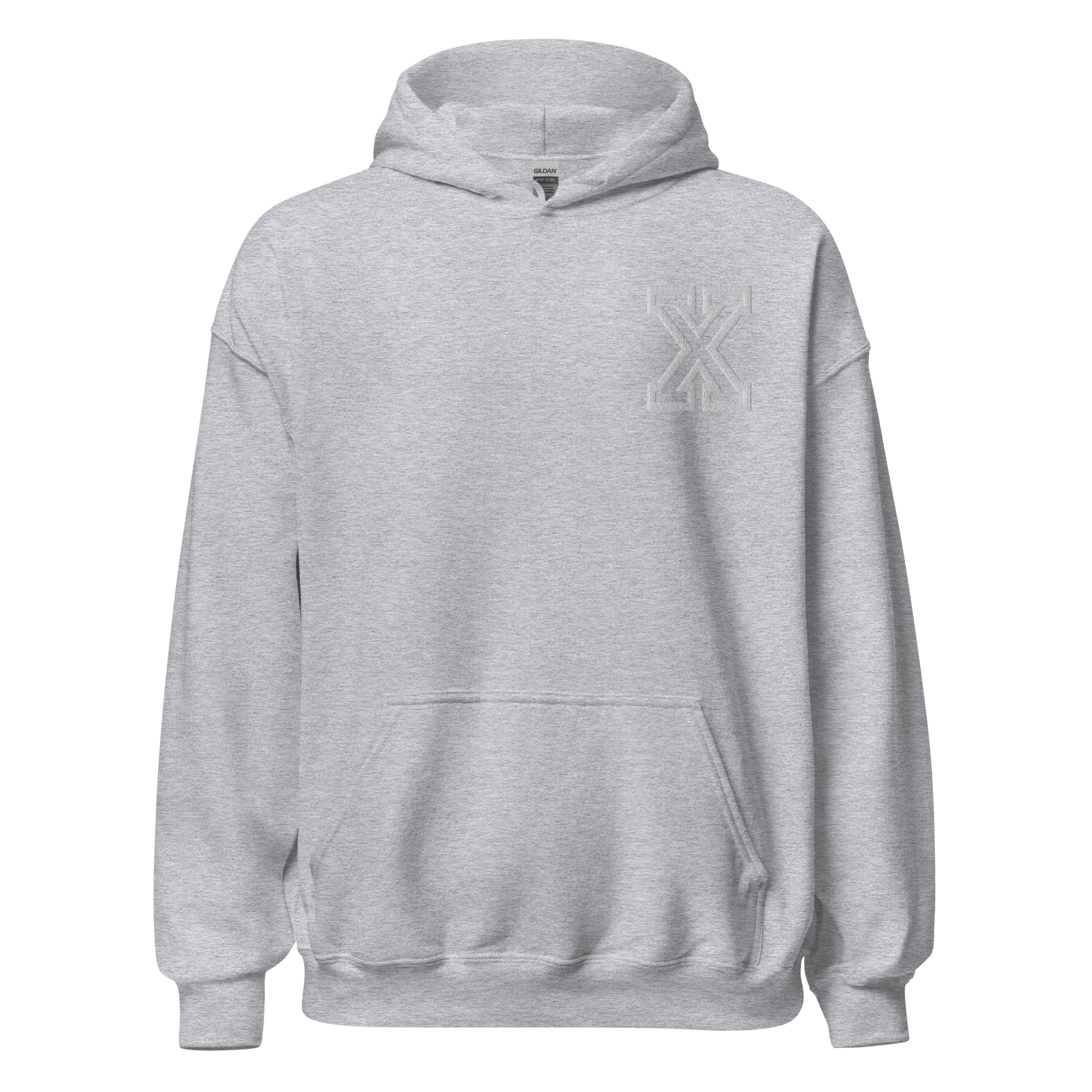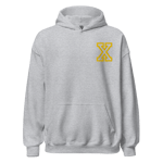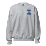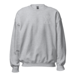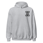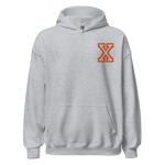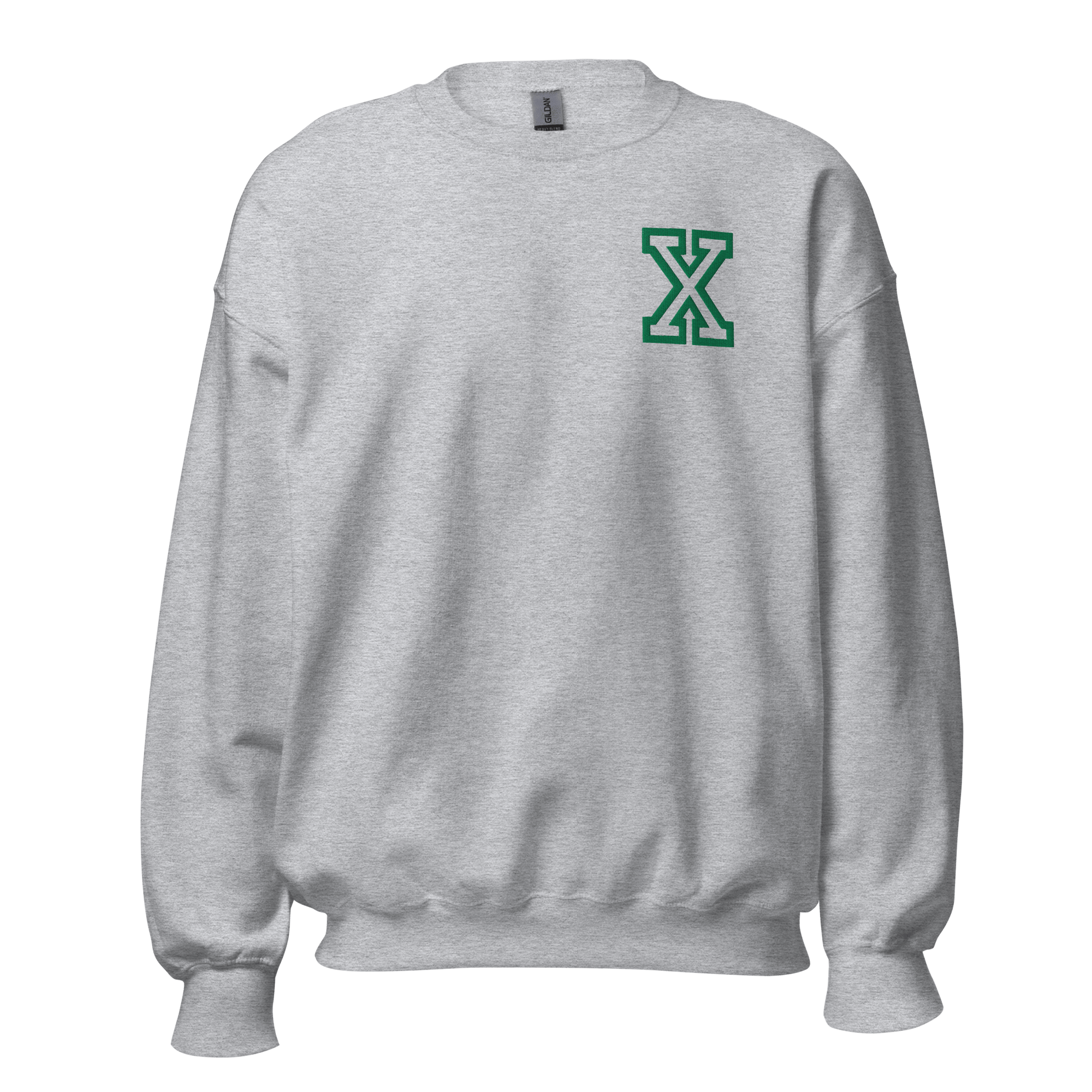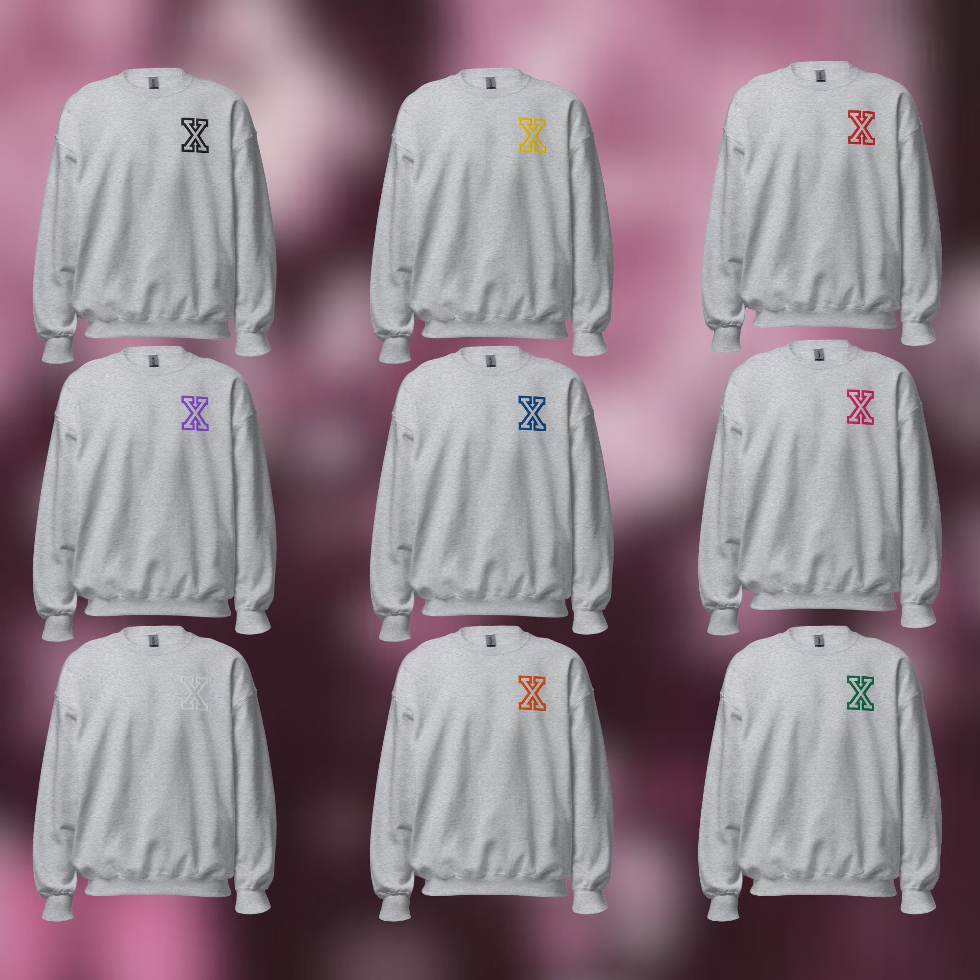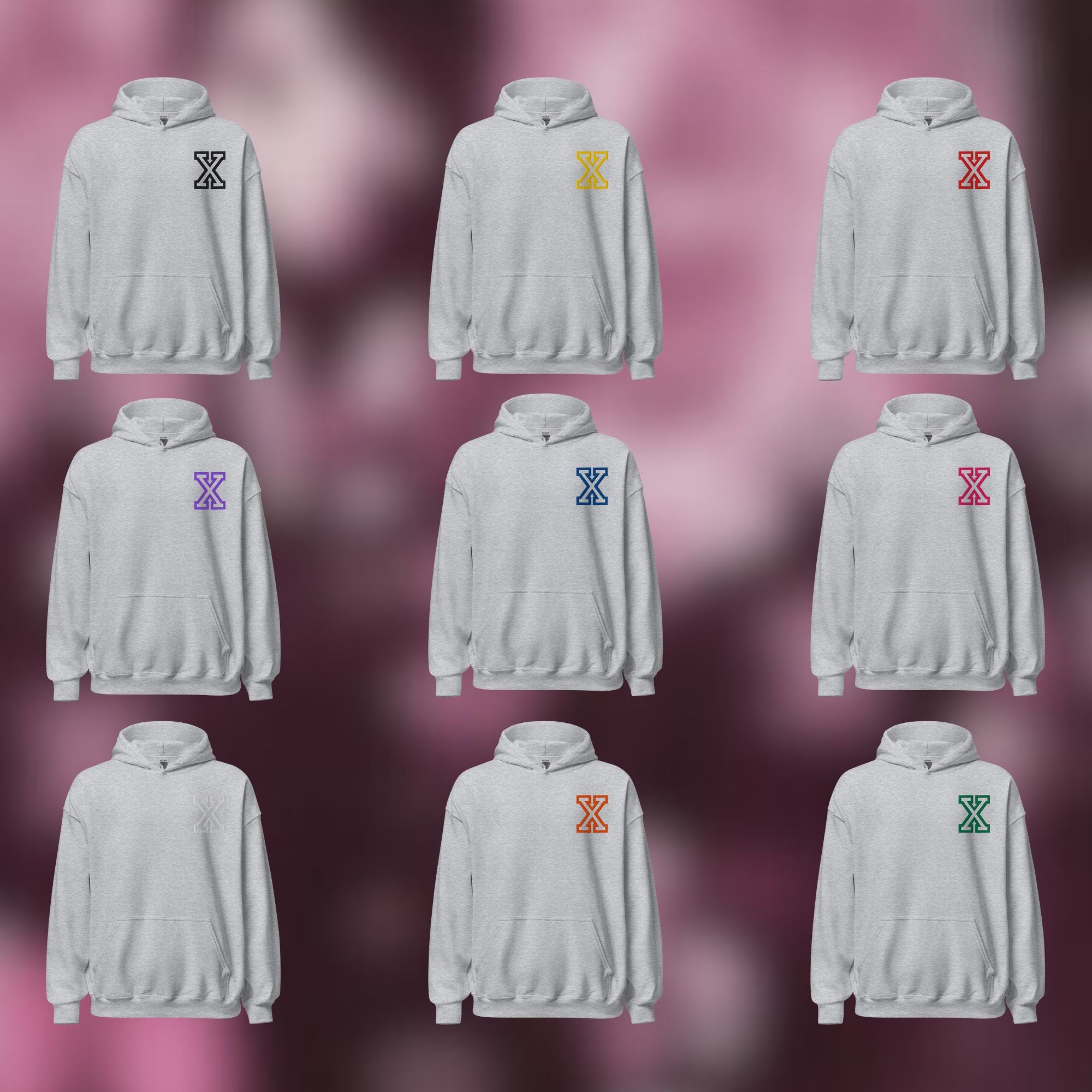 Our signature X embroidered on the left chest (NO BACK DESIGN) on your choice of Gildan 18500 heavy blend 50/50 poly/cotton pullover hooded sweatshirt or Gildan 18000 heavy blend 50/50 poly/cotton crewneck sweatshirt in ATHLETIC GREY, with your choice of embroidery color. Lots of options here, so go crazy!