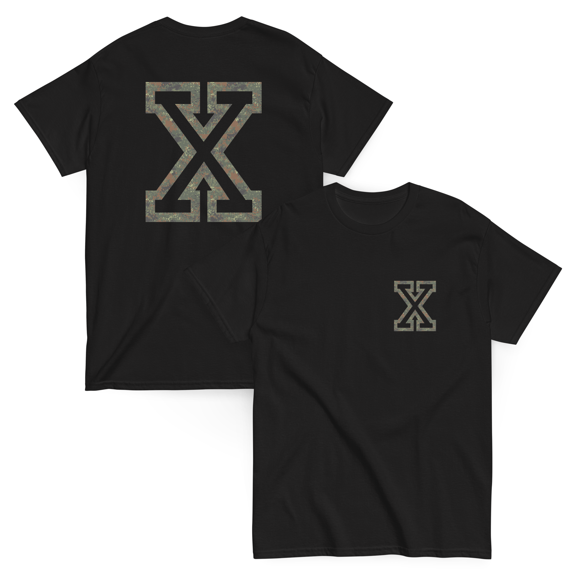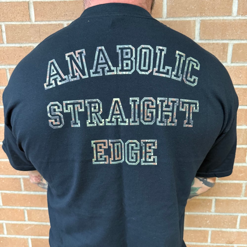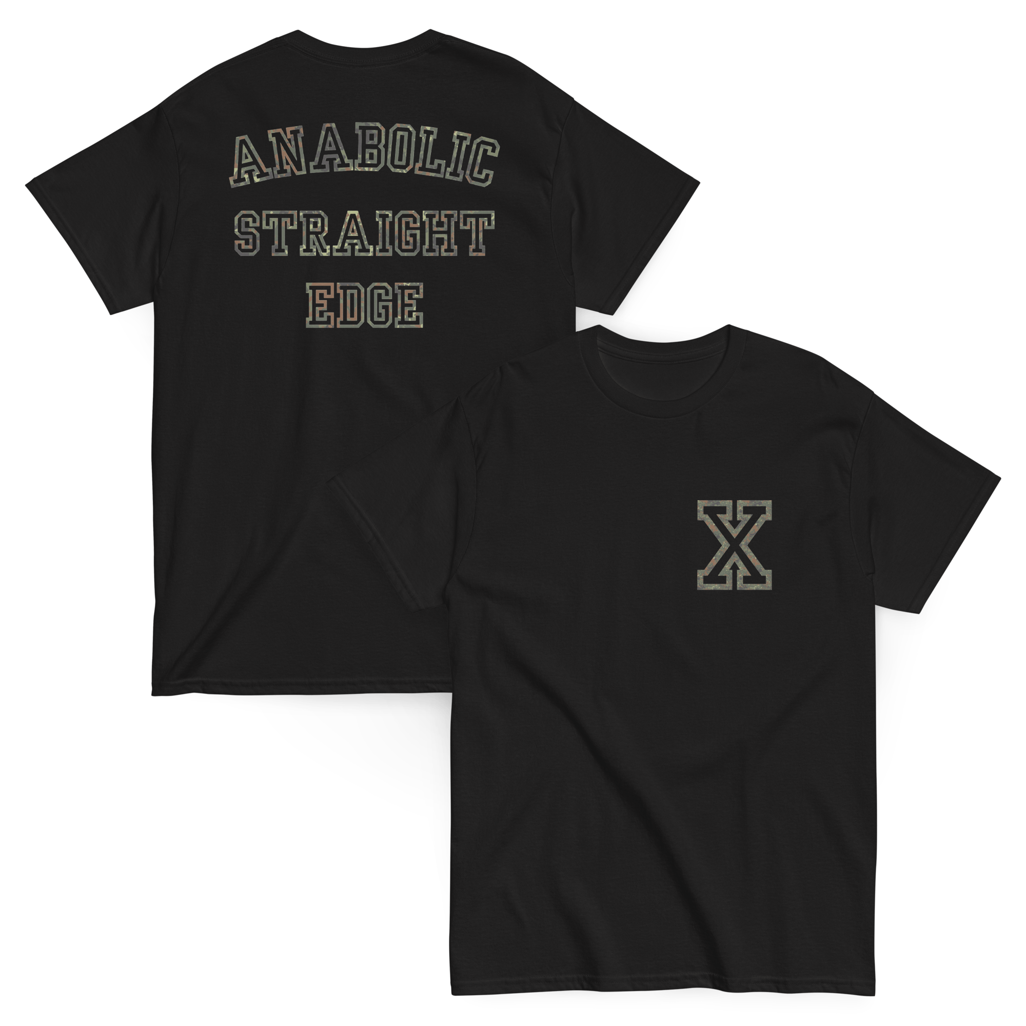 Our signature X pocket print shirt in flecktarn camo with your choice of Anabolic Straight Edge logo or Big X back print comes as a high quality 2 sided print on your choice of Gildan 5000 heavyweight or Comfort Colors 1717 100% cotton BLACK t-shirts. (See links for full specs)